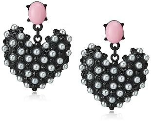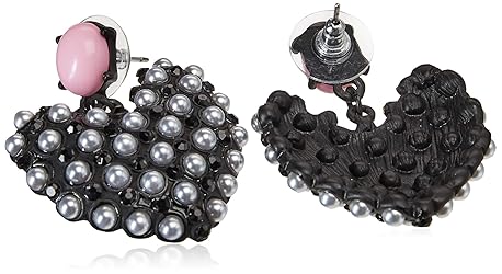- Betsey Johnson black heart drop earrings embellished with pearls and pale pink cabochon accent at top. Earrings are set in black plated metal with a post back closure.