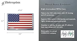Premium Materials: Brand New - Chrome All Metal USA Flag Auto Emblem 3.4" x 2.2" x 0.2" with the highest plating specs on the market Easy Installation: No Tools or Glue Needed - Emblems attach with a simple peel-and-stick application via paint-safe adhesive foam tape High Quality: Exquisite craftmanship - Emblem will last for years and will not be affected by extreme weather or car washes Universal Fit: Can be placed anywhere - All you need is a flat smooth surface Elektroplate, founded in 2003, is a leading supplier of high-end automotive interior & exterior accessories. The Elektroplate line is currently found in over 15,000+ store locations Nationwide.