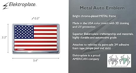 - Red, White and Blue USA Flag auto emblem (3.4" x 2.2" x 0.2") by Elektroplate. An all-metal emblem with a chrome metal frame and a full-color domed decal insert. The decal is UV-protected with a laminated 1/8” thick PVC made to withstand any outdoor conditions. The emblem attaches via paint-safe 3M adhesive foam tape. All Elektroplate car emblems are comprised of a chrome metal finish made to withstand harsh outdoor conditions. This auto emblem will look brand new for years to come. Our high-end auto emblems are the perfect way to showcase your patriotism everywhere you drive. In addition, all Elektroplate chrome emblems are packaged in elegant retail packaging to make a great gift!