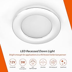 - Pack of six! 12V Bright recessed down light fixtures are here! Our LED down light provides bright 200 lumens intensity without glare. Using advanced LED technology, these lights have stable performance and long life span up to 50,000 hours. Recessed mount design is for neat finish after installation. Silver bezel and classic appearance make it an elegant light fixture. Small light body fits narrow places well. It can act as ceiling lights, cabinet lights, kitchen lights or anywhere it could fit in vehicles. You will love these down lights with great LED lighting effect! Search B00S4CPL5U on amazon for a 10-PACK. Specifications: Input voltage: 12volt DC Current draw: 250mA Wattage: 3W Luminous flux: 200 lumens Lighting color: warm white, 3000K Lighting angle: 120 degrees Bezel: silver chrome finish, 2.76 inches / 70mm Cutout: 2.08 inches / 53mm No mounting hardware included Features A.Low power consumption with bright 200 lumens intensity. B. Providing thesame intensity, the power consumption of this LED light is about 4 times lower than the consumption of halogen light. C. Slim and lightweight design is suitable for limited space such as under cabinet, cabin, display case, locker, etc. D. Service life - more than 50,000hrs Little tips This light is designed for 12volt DC applications, like RVs. For other applications, like home (110volt), please get professional electrical instructions for wiring. Its small body makes it perfect for interior vehicle uses. Dimension: 2.76 x 2.76 x 0.6 inch, cutout: 2.08 inch. Make sure it fits your application. Wiring: black wire for positive and white wire for negative/ground. Switch the polarity if necessary. Wire them in parallel, not in series.