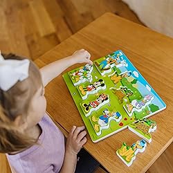 Chunky Wooden Disney Puzzle Fun – 8-piece wooden chunky puzzle features classic Disney characters like Mickey Mouse and friends, perfect for toddlers who love imaginative play and early learning Thick, Easy-to-Grasp Puzzle Pieces – Extra-thick wooden pieces are designed for small hands to grasp, place; even stand upright for pretend play to spark imaginations and storytelling beyond the puzzle board Matching Images for Guided Play – Full-color matching pictures underneath each piece help guide placement, encouraging fine motor skills, hand-eye coordination, and character recognition Sturdy and Durable Puzzle Board – Solid wooden puzzle board is built to last through repeated use, making it ideal for both independent solo play and playdates Great Gift for Ages 2 and Up – A delightful screen-free activity and gift for Disney-loving toddlers and preschoolers; perfect for birthdays, holidays, or anytime learning fun