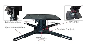 Tightening ring must be loose when the main bolt is tightened. (Recommended) Watch the step-by-step video guide on manufacturers website. This will help hold the product nice and strong, preventing flimsiness. Completely universal design includes four versatile, extendable arm components. The included washer and thumb-screw adjustment allows tool-less, no-slip alignment of any projector. Durable, black, steel construction is built to last. Height adjusts from 2.75" to 3";15 degree tilt, 360 degree rotation lets you align your projector like a professional.