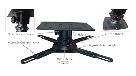 - The Universal Projector Mount by Silver Ticket Products is a durable, well-designed, adjustable projector mount intended to fit all types of both old and new projectors. Its simple design is intended to provide a stable, safe way for you to mount your projector exactly where you need it. This mount features adjustable extension arms that are compatible with mounting patterns up to 9.625" x 9.625". The Universal Projector Mount comes in three models, each with different vertical extension heights, so choose the one that is just right for your application. This mount is crafted from high-grade steel for powerful durability at an affordable price.The Universal Projector Mount includes four extendable, swiveling, spider-type arms for completely universal mounting capability. Easily position your projector with the tool-less tilt-adjustment knob and tool-less washer and thumb-screw vertical extension adjustment. The Universal Projector Mount allows steady, secure placement of any projector from 2.75" to 3". Full 360 degrees rotation and 15 degrees tilt adjustment allows for perfect alignment of your projector.Servicing your projector is simple with the tool-less quick-release system. This projector mount is the perfect choice for any setting - whether it is a classroom, boardroom, home theater, or anywhere else you may need to install a projector. Choose this projector mount from Silver Ticket Products... you'll be glad you did!Included in the box:1 x Universal Projector Mount with 2.75" to 3" vertical extension, ceiling plate, and hardware1 x Quick Start Guide