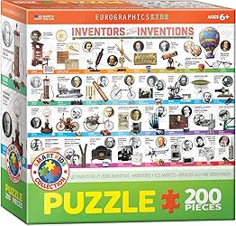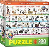 - EuroGraphics Inventors and their Inventions 200-Piece Puzzle. Box size: 8" x 8" x 2.37". Finished Puzzle Size: 13" x 19". Who invented the printing press? The automobile? Calculators? Television? Answer these questions and more with this educational puzzle featuring great inventions and the inventors who created them. Strong high-quality puzzle pieces. Made from recycled board and printed with vegetable based ink. This superior quality puzzle will delight and educate all at the same time.