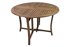 - This 48″ Dia. Round Folding Table is made from sustainable, plantation grown Brazilian eucalyptus and is finished with a beautiful brown umber stain. The table ships fully assembled and can easily go from a setup dining table to a single drop leaf to completely folded down. The table has an umbrella hole as well as an umbrella clamp that acts as a built-in umbrella base.Care & Maintenance :For cleaning, use a mild detergent and a soft cloth. Do not use abrasive cleaners or cleaning products. To maintain the stained finish on your Outdoor Interiors Brazilian Eucalyptus furniture, we recommend teak, refined or boiled linseed oil to be used at least 2 times in the spring/summer sunny seasons. The number of applications vary depending on direct sunlight, temperature and dry climate versus more humid regions. The look of your furniture will provide tell-tale signs along the way, so “Please Oil” accordingly.Many items can be oiled in actual work time under 15-20 minutes with light cleaning first. Do not apply any oil in direct sunlight. Apply oil generously and wipe away excess oil with a dry cloth approximately 1-2 hours after application and potentially the next day as well.Always cover or store away your furniture during harsh weather and the winter season.CAUTION: Oil soaked rags should be disposed of carefully.