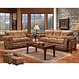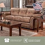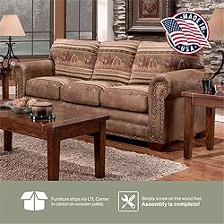 Materials: Microfiber, solid wood Finish: Brown Leather look solid color microfiber with lodge look cotton tapestry fabric Comfortable foam seat and back cushions are wrapped with fiber for a comfortable seat Nail head accents bring a rustic look to this group Sturdy pull out bed mechanism for years of use The fabric on this item is NOT pet friendly. Returns resulting from pet damage will not be allowed. Inner spring, quilted top queen mattress Frames are warranted to be free from defective materials and manufacturing defects for a period of one year from the date of purchase under normal household use All cushions are warranted against loss of resiliency for a period of one year from the date of purchase