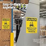 DURABLE ALUMINUM: 'Watch For Forklift Traffic' signs are made from heavy-duty 40 mil thick aluminum. Unlike steel signs, our aluminum signs do not rust. Signs easily last up to 7 years outside. EASY INSTALLATION: Signs have four 3/16 inch corner holes. Mount with screws, nails, tie-wraps or wires. Signs can also be attached with foam or double-sided velcro tape. Sign attachment accessories are not included. LAMINATED PROTECTION: With lamination, graphics are protected from weather and abuse to preserve a fresh look. Graffiti can be cleaned off too. Clear UV laminate resists chemicals, UV rays, water, and abrasion. OSHA COMPLIANCE: Safeguard your workplace from accidents and liabilities by placing our high-quality signs that follow OSHA regulations. These are universally recognizable and encourage safe work practices. PACK CONTENTS: One 14 x 10 inch black and yellow aluminum sign.