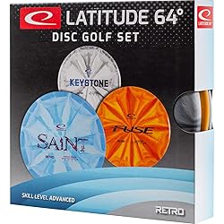 Latitude 64 Retro Burst Disc Golf Starter Set (3-Pack) - Includes Keystone, Fuse, Saint | Grippy Base Plastic | Perfect Beginner Disc Golf Set | Contains Putter, Midrange & Driver | Colors Will Vary