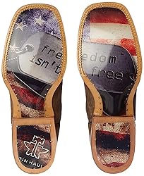 - pMade for the fashion crazed boys of today Tin Haul boots embody the heart and soul of a cowboy with their flamboyant designs and raw manliness. Thats what ensues when you blend in innovative aesthetics and thematic graphics to roper style cowboy boots. Dare to sport Tin Haul boots for standout cowboy flairppShow your support to our soldiers who protect our freedom and lands with style. As part of the freedom collection Tin Haul Freedom boots are handmade and meticulously crafted supple full grain leather constructions. This custom made pair is ornamented with embroidered cameos on the 11 brown distressed leather shaft and feature a brown easy on pull straps and accentuated with freedom stripes. The vamp is brown crackled leather. Whats mesmerizing is the fact that Tin Haul takes premium leather and treats it industriously to incorporate wrinkling scuffs and distressed marks that render a risqu overlay to design.ppThe modern wide square toe profile leather lining double stitched welt and low profile leather heels are what make these shoes so unique. The pure leather lining and cushioned insole afford maximum comfort and breathing space for your feet. For all you compadres and patriots these flashy shoes could set you up for a fashionable ensemble. Let each step tell its own story as you saunter down the lane in this duo.ppThe standout feature of Tin Hauls collection is its awe-inspiring obvious soles designs incorporating eye catching graphics and themes. For these renegades we have a dog tag printed sole stating Freedom isnt free when you pair the soles together and a Tin Haul anvil on the right heel. The soles are covered in a hard plastic coating that protects them from wearing out and keeps the shoes from slipping. ppUp your game with a pair of Tin Haul todayp
