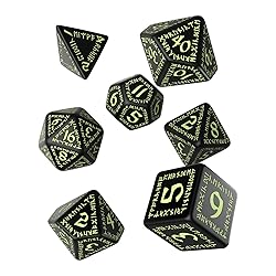 - Runic Black & glow-in-the-dark Dice Set! Runic dice are one of the first ever created by designers in Q WORKSHOP, and we always remember them, as our first step to conquering the world with our dice. First Runic Dice were handmade and hand-painted in such meticulous passion that to this day we are bewondered by their quality and charm. Runes are always a mystery. These sigils, full of secrets are always something that catches the eye and raises questions about the forgotten lore of ancients. The runes used to functioned as letters, but they were much more than just letters. Each rune was a sigil of some supernatural power and to write a rune was to invoke and direct the force for which it stood. Runes were traditionally carved onto stone, wood, bone, metal, or some similarly hard surface rather than drawn with ink and pen on parchment. This explains why we choose them for carvings on the dice. We wont to make durable dice imbued with the power of magic because there is “real magic” in roleplaying games. Now you can “write” tales about your adventures with Runic Dice. A little bit of mysticism These dice are marked with the Runic alphabet that makes them more than normal sets. People have been studying Runic writing for ages. Our designers have consulted the use of Runic alphabet not only with Nordic runemasters but with the last Dwarven race representatives too. We have made all that we could in order to make near all your dice rolls successful! The Runic Black & glow-in-the-dark Dice Set is imbued with the power of rune LAGUZ. This rune is associated with the universal ocean and its inner power that is waiting in depths and its life-giving glow, combining past, present, and future. Water is a symbol of life and unstoppable power that bypasses all obstacles. This rune looks like a magic arrow that pierces everything like water. These dice are for all mages and heroes concentrated on their inner power. They should be as a light in the darkness when their wisdom saves the day. These are our most mystery runic dice, dedicated for real professionals in spell bending.