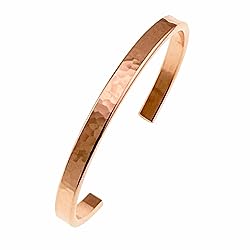 - Rich color and an earthy texture combine to make pure perfection in the look of the John S Brana Hammered Copper Cuff Bracelet. This beautifully crafted bangle bracelet has a very chic silhouette because of its thin design. At just 1/4 inch in width, the piece is perfect for layering without your jewelry appearing clunky or overdone. As chic on its own as it is when worn in groups or with other coordinating pieces, the bracelet goes from day to night with ease to complement everything in your wardrobe.Handmade in the USA, the John S Brana Hammered Copper Cuff Bracelet is genuine copper that has been formed into a perfect circumference to fit a variety of wrist sizes. The bracelet has an intricate texture produced by hammering for a look that is on the pulse of today's biggest fashion trends. Made out of 100 percent copper that is left in its natural, uncoated state, its rosy color can be restored at any point with Ketchup or any Copper Cleaner or allowed to patina for a more natural organic look. It also makes a great 7th Wedding Anniversary present! Available in the following sizes (opening is included in the circumference): 8 1/2 inch circumference with 1 1/2 inch opening; 8 inch circumference with 1 1/4 inch opening; 7 1/2 inch circumference with 1 inch opening; 7 inch circumference with 1 inch opening; 6 1/2 inch circumference with 1 inch opening. Made from genuine copper for the look of rose gold at a reasonable price Highly polished and finished Includes a designer branded gift box