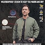 - Tackle the elements with our iconic MA-1 Flight Jacket, equipped with warm poly fiberfill for exceptional insulation, keeping you warm in cold conditions. The bomber jacket features a nylon water-repellent outer shell that provides protection from light rain and snow. Unbeatable Comfort and Warmth: These aviator flight jackets feature a soft ribbed knit collar, cuffs, and waistband for additional heat retention and insulation while blocking out the wind. The MA-1 bomber jacket has an extra full cut for a comfortable fit with room underneath for extra layers, ideal for winter and cold weather. Utility Pockets: The outdoor pilot’s coat comes equipped with 5 pockets: 2 front slash pockets and 2 inner welt pockets for everyday essentials, and what’s a bomber jacket without a zippered utility sleeve pocket!? Along with exterior pen holders, this useful pocket is great for storing small items. Iconic MA-1 Styling: Inspired by the original design for fighter pilots, our rugged and dependable MA-1 Flight Bomber Jackets feature a reversible orange polyester lining that offers alternative style options. The zippered front closure with double ‘MA-1’ pull tabs and storm flap, brass zippers, and leather pull tab pays homage to the jacket’s heritage, functionality, and style. Take Flight: Whether you are active-duty personnel, aviation enthusiast, or outdoor adventurer, the pilot bomber jacket is perfect as a windbreaker for spring and fall seasons while presenting a classic style that is great for casual outings and everyday use.