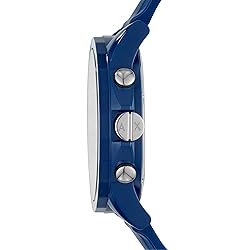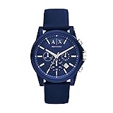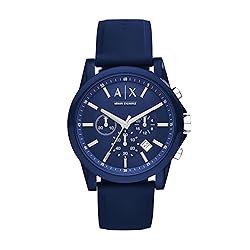 STYLISH: This Armani Exchange watch features a blue satin dial, chronograph movement and blue silicone strap CASE & MOVEMENT: A men's watch with a 44mm case, 22mm band width, scratch resistant mineral crystal, accurate quartz movement with chronograph analog display, imported DIAL: These men's watches feature a round nylon case with a blue dial WATCH BAND: Wrist watches for men with a blue, durable silicone band with a secure single prong strap buckle closure WATER RESISTANT MENS WATCH: Up to 50m (165ft); Wearable while swimming in shallow water; 5 ATM