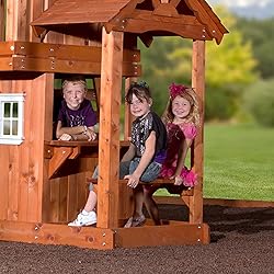 Elevated Adventure: Raised clubhouse with a wooden roof and mini porch is perfect for outdoor play Lower Playhouse: Charming play space featuring windows with white trim adds a realistic touch to inspire creativity Industry-Leading Warranty: 5-year warranty for added peace of mind Snack Bar Station: Covered snack counter with bench seating creates a cozy café setting, ideal for enjoying snacks and imaginative play Versatile Swinging Fun: 2 classic belt swings and 1 trapeze allow multiple kids to swing at once Speedy Wave Slide: 8-foot wave slide offers swift, safe descents for endless fun every time Rock Wall Ladder: Equipped with 6 climbing holds and doubles as a ladder for safe, easy accessibility 100% Cedar Wood: Made from durable cedar wood for exceptional strength and natural resistance to decay, with a rustic burnt sienna stain; Stain saturation and color may vary Ready to Assemble: Pre-cut, pre-drilled, and pre-stained pieces, paired with guided instructions in the interactive BILT app, offer easy installation Safe Play: Designed with multiple play areas for up to 7 kids, Backyard Discovery swing sets are engineered to meet or exceed ASTM standards (code F1148-22); For residential use only