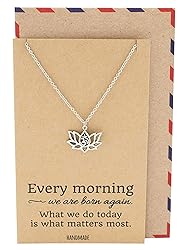 Elevate your Spirit with a Handmade Lotus Necklace. This handmade necklace features a dainty om lotus flower pendant, accompanied by a gift card with a quote that reads "Every morning we are born again. What we do today is what matters most. The lotus is a flower of great beauty and spiritual significance. It rises from the muddy waters of life to bloom in the light of the sun, symbolizing the journey of the human soul towards enlightenment. A Gift that keeps giving. This necklace comes packaged in a quote card. You can send it to your friend, sister, cousin or any anyone you loved. A Yogi inspired gift that is not only a beautiful and meaningful accessory, but it is also an inspirational gift with trademarked packaging. It is a quality-built gift that is durable, long-lasting, and stylish made to accentuate your look for any occasion. The design of this necklace is simple yet elegant, featuring a sterling silver necklace with a lotus flower pendant and chain. The pendant is made of silver rhodium plated material and the chain is made of stainless steel, known for its durability and non-tarnishing characteristic. The length is adjustable from 16 to 18 inches and the jewelry is nickel and lead free. As a devoted admirer of the lotus flower, there is no better way to express your love for this symbol of spiritual growth and purity than with the stunning lotus flower necklace.A perfect for Christmas, Valentine's Day, congratulations, birthdays, anniversaries or any other special occasion for yourself, your best friend, or your family. This necklace is a beautiful reminder of the power of the human spirit to rise above adversity and reach new heights of understanding and enlightenment. Proudly USA-owned, we stand behind our products with a 90-day hassle-free return policy. Our satisfied customers are a testament to our commitment to quality and service, which drives our growth and allows us to offer an ever-expanding selection of designs for you to enjoy.
