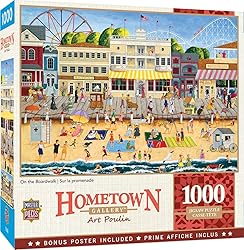 HOMETOWN GALLERY: Folk art puzzles feature vintage scenes that remind us all of simpler times; perfect for creating fun moments and recalling the good old days with family and friends; a wonderful gift for yourself or any puzzle enthusiast UNIQUE SHAPES: Puzzle features 1,000 pieces in a variety of cuts ensuring a challenge; thick interlocking pieces secure tightly; matte finish reduces eye strain; a vibrant, full-color poster is included to reference as you piece it together ENVIRONMENTALLY RESPONSIBLE: MasterPieces is an American Puzzle & Game Company; our puzzles are made from 100% recycled material and non-toxic soy-based inks CHALLENGING: Our puzzles are designed to be both fun and mentally stimulating; help with relaxation; boost problem solving skills; great social activity with family and friends ENTERTAINMENT FOR ALL: MasterPieces’ collection offers the perfect way to keep game night fun; select from jigsaw puzzles for adults, seniors, and kids; unique decks of playing cards, board games, dominoes, crafting kits, and more
