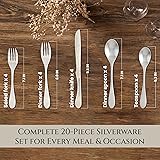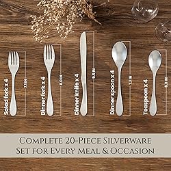 Set includes: Service for 4 - 20 piece matte Original style silverware set: 4 each of dinner knife, dinner Fork, salad Fork, Soup Spoon and teaspoon, flatware cutlery set INVENTIVE: hand-forged Patented design; Original style Useful, classic design to fit any tableware, perfect for daily use, gathering, parties, camping, restaurant, hotel or when you need extra silverware set IMPOSSIBLY CLEVER: Forks have cutting power; ergonomically designed each piece a cut above the rest. PERFECT FOR ANY OCCASION - Whether it's a formal dinner party or a casual family meal, this flatware set is suitable for any occasion. Impress your guests with this stunning silver set by Knork.Heavier weight, balanced feel, and a comfortable eating experience ELEGANT DESIGN - Upgrade your dining experience with the Knork Matte 20-Piece Flatware Set. Its sleek and modern design will add a touch of sophistication to any table setting. DURABLE MATERIALS - Made from high-quality, heavy-weight stainless steel, this flatware set is built to last. The matte finish adds a unique touch to each piece and prevents scratches and stains.Modern, sleek styling, matte brushed finish VERSATILE SETTING - This 20-piece set includes everything you need for a complete dinner setting for 4 people: 4 dinner forks, 4 salad forks, 4 dinner knives, 4 teaspoons, and 4 tablespoons.Stainless steel, dishwasher safe It has probably never occurred to you that your flatware could be better, but it can. That’s where Knork comes in. All of the Knork pieces feature a modern profile, Comfort finger platform, and a balanced weight that lead to an Experiential and comfortable dining experience.