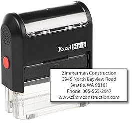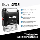 Personalize up to five lines for your own custom stamp - Hit the "Customize Now"button to add your information. Self-inking design allows for quick, reptitive stamping. Ink pads are replaceable and re-inkable with ExcelMark self-inking ink. Attractive, clear mount allows you to accurately line up your stamp. Impression area: 7/8"x 2-5/16", Up to 38 characters per line Choose your ink color: black, red, blue, purple, green or brown