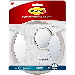 WALL MOUNT MIRROR: 2 packages of the Command Bath Mirror include 2 bath mirrors and 4 medium water-resistant adhesive strips DAMAGE-FREE BATHROOM ORGANIZATION A satin nickel finish makes this the perfect shower accessory for shaving in the shower NO TOOLS REQUIRED - Water-resistant strips have been tested and proven to hold better than suction cups with no holes, no drilling, and no damage STRONG AND VERSATILE- Wet and humid conditions are no match for this mirror. It can stick on many surfaces, including glass, mirrors, tile, fiberglass, wood, and painted surfaces REMOVES CLEANLY- No sticky residue. No damaging screws or nails