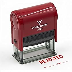 - The Vivid Stamp REJECTED by Date Self Inking Rubber Stamp is a reliable tool for clearly marking documents, forms, and correspondence that have not been approved or accepted. Constructed with a durable plastic body and a precision cut rubber text plate, this stamp delivers crisp, legible impressions consistently, making document handling more organized and efficient. Its self inking design includes a re inkable stamp pad, allowing for quick ink refresh without replacing the entire unit. Available in three practical sizes, it works well on a variety of paperwork, from small slips to full size forms. Ink color options include red, blue, and black, providing flexibility to match your workflow or filing system, while the stamp body comes in a variety of colors for easy identification in shared workspaces. With an ergonomic design and smooth press action, it ensures even impressions with minimal effort. Ideal for offices, administrative teams, and businesses, it helps maintain clear, organized records and simplifies document processing.