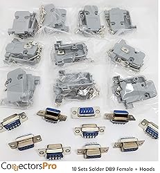 - This 20-piece set—10 Sets Solder Cup DB9 Female + Plastic Hoods (9 Pins D-Sub Connector & Hood Set)—is perfect for assembling and repairing RS232 serial cables with reliability and precision. Each set includes a DB9 (DE9) female solder-type connector and a matching gray plastic hood, totaling 10 connectors and 10 hoods in the pack. This 20-piece set includes DB9 (DE9) female solder-type connectors and matching gray plastic hoods, ideal for assembling custom RS232 serial cables. Each connector features a tin-plated metal housing designed to provide reliable performance in high-intensity and mission-critical environments. With a solder cup interface, these connectors offer an easy and secure method for establishing permanent connections between cables and devices. The included gray plastic hoods are lightweight and durable, offering strain relief and protection for your soldered connections. Each hood is engineered to fit snugly with the DB9 connector and comes with mounting hardware for easy assembly. The connectors and hoods are packaged for convenience, making them suitable for both professional technicians and DIY enthusiasts. Built from high-quality materials and rated for safety and longevity, this combo pack supports wire gauges up to 20 AWG and complies with UL94V-0 insulation standards. Whether used in industrial control systems, data transmission setups, or repair tasks, these connectors deliver dependable connectivity and streamlined installation.