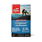 - Give your canine companion the protein-rich nutrition it needs with ORIJEN Original Dry Dog Food. This grain free* dry dog food kibble is packed with antioxidant-rich ingredients and Vitamin E to help support a healthy immune system and provides naturally occurring Omega-3 and Omega-6 fatty acids to support healthy skin and a shiny coat. This ORIJEN dog food recipe is made with 85 percent** fresh or raw quality animal ingredients like free-run*** chicken, free-run*** turkey and wild-caught fish. The first five ingredients of this high protein dog food are fresh or raw chicken, turkey, salmon, whole herring, chicken liver, giving your dog a strong source of protein, vitamins and minerals. ORIJEN WholePrey ingredients including organs and bones to provide your dog with the most succulent and nutrient-rich parts of the prey. Our included fresh ingredients are delivered refrigerated and our included raw ingredients are delivered frozen. NOURISH AS NATURE INTENDED. *Produced in a facility that also processes grains **Approximate 85%, Derived from the unprocessed state of the ingredients. ***Our free-run chickens and turkeys are not housed in cages and are able to move in a barn without outdoor access.