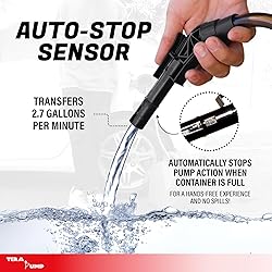 [ NEW AND IMPROVED ] Featuring Universal Built-In Adapter fitting most standard 3-5 Gallon sized gas cans and jugs | Heavy-Duty Vinyl Hose for better resistance to small cuts and damages | Metal Impeller Housing for enhanced protection from accidental drops | Ergonomic Nozzle Handle engineered for maximum comfort and ease of use [ HASSLE-FREE TRANSFER ] Tired of lifting heavy 5-gallon gas cans and dealing with messy spills? Our patented Auto-Stop Sensor stops the flow when the container is full ensuring no more overflows! Also experience the newly designed Ergonomic Handle for easy and comfortable grip, while the secure Nozzle Clips keep the hose firmly attached to the receiving container for safe, spill-free transfers. You can operate the pump with just one hand—or even hands-free! Great for refueling your Vehicles, ATVs, Tractors, Boats, Mowers, Generators and more! [ REACH FARTHER WITH CONFIDENCE ] The 39-inch long discharge hose allows you to reach farther while transferring fluids with ease. Made from thick, heavy-duty vinyl, it’s built to resist cuts and cracks, giving you a hose that’s both durable and leak-resistant. Plus, our rainproof battery cover ensures that your pump stays protected from light rain or splashes. Perfect for homes, small businesses, outdoor activities, garages, farms, and more! [ POWERFUL SYPHON ACTION ] Powered by 4 AA batteries (with an emergency mode that operates on 2 batteries), Transfers up to 2.7 gallons per minute. Simply press the on-button to start! The Nozzle Holder, conveniently located next to the battery compartment, makes storage a breeze. Suitable for gasoline, E15, E85, diesel, kerosene, and non-potable water (Note: Batteries & gas can not included). [ UNIVERSAL BUILT-IN ADAPTER ] The universal threaded adapter is built-in for your convenience—no need to search for extra adapters to fit your gas cans and jugs. The 18.1" flexible intake hose reaches the bottom of any 3-5 gallon container, even irregularly shaped ones. Lightweight and compact, this portable pump is perfect for everyday use, travel and emergencies. It also comes beautifully packaged, making it an ideal gift for any occasion! [ WE'RE HERE FOR YOU ] TERA PUMP has been manufacturing reliable pumps for over 20 years and backs their product with a 1-Year Warranty on Manufacturer Defects. Tera Pump also offers a wide range of pump products to meet all your everyday and unique transfer needs. Feel free to contact us anytime!