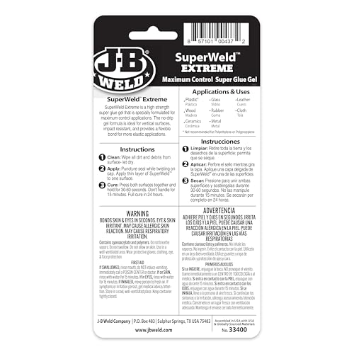 - J-B Weld SuperWeld EXTREME: is a specially formulated Super Glue that provides a strong, flexible bond. SuperWeld Extreme has a precision tip, no drip formula and is ideal for both vertical and horizontal surfaces!