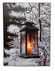 Lighted wall decor. Awesome lighted canvas showcasing a stunning black lantern in the crisp white snow. Perfect placement of the LED light inside the lantern. Christmas wall art. What a great winter picture to hang up for the holidays. Bright white snow in a forest setting. The tree trunks are covered with fresh, fallen snow. Canvas print. Light up LED wall art is the perfect addition to any décor. Hang it in a mud room, living room, hallway, kitchen or bathroom. The LED light in the lantern glows so bright, it makes this artwork look so realistic. Farmhouse decor. These prints come ready to hang right up on your wall. It's stretched on a wood frame with a fabric backing so it's a very sturdy piece of artwork. Light up pictures for wall. Wood frame stretched canvas print 3/4" thick. Requires 2 AA batteries (Not Included). On/Off switch on side of frame. Measures 11.75" x 15.75"