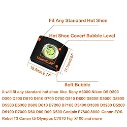 KEEP YOUR HOT SHOE CLEAN- Avoid expensive camera repairs by using the hot shoe bubble level to cover your cold and hot shoe when not in use, while simultaneously keeping all your photos and vides level. Keeps dust and moisture out with our hot shoe cover & protect from scratches. CONVENIENT TO USE- The hot shoe cover easily mounts on any hot shoe or cold shoe enabling you instant perspective control for all your shots. MUST HAVE FOR PHOTOGRAPHY-- Great for perspective control, tilting and panning video shots, real estate photography. Take higher accuracy, level photos with our hot shoe cover / hot shoe bubble level / hot shoe level. UNIVERAL HOT SHOE LEVEL-It will fit any camera that has a standard hot shoe for external flash attachments like Sony A6000 Nikon D5 D200 D300 D500 D810 D610 D700 D750 D810 D800 D800E D5000 D5600 D5500 D5300 D600 D610 D7200 D7100 D3400 D3300 D3200 D5200 D5100 D7000 D60 D80 D90 D600 Coolpix P7800 8800 Canon EOS Rebel T3 Canon t5 Olympus C7070 Fuji X100 LIGHTWEIGHT AND HANDY-The hot shoe level is made of soft rubber,it will not crack when you drop it HOT SHOE BUBBLE LEVEL- It comes with the bubble spirit level on the hot shoe protector, You can easily see whether the bubble is centered,you could have a precise horizontal measurement at anytime,bubble spirit level will help the photographer achieve a finer degree of accuracy in capturing image content