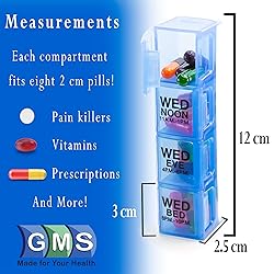 » ORGANIZED: The GMS 4x/Day Weekly Pill Organizer will help keep your medication schedule on track. The tray features a detachable row for each day of the week. Each day has four compartments to organize your pills by time of day. » STRONGER THAN EVER: The new latch is now stronger than ever! The sturdy plastic lids close tightly to prevent spilling or mixing of vitamins, supplements, and medications. Each lid also features braille to assist the visually impaired in using the product. » REMOVABLE: Each of the seven daily pill boxes can be detached from the base, making it possible to take a days' worth of pills with you on-the-go. The daily compartments are small enough to fit in a bag or pocket for easy travel and transportation. » REGIMEN: Weekly and daily pill management is made simple with the GMS pill dispenser. Organize your medications, vitamins, and supplements for the week with the convenient, secure compartments. Utilize the four labeled time compartments to separate pills into the correct time of day (morning, afternoon, evening, and bedtime). » PRODUCT DIMENSIONS: 10" x 5 5/8" x 1 3/8"