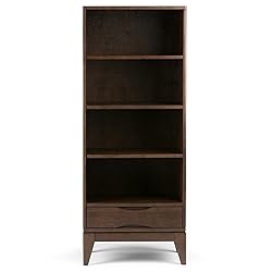 - Bring the organic charm and functional design of mid-century modern style to your home with the Harper Solid Wood Bookcase with Storage. Handcrafted from high-quality solid wood, this storage unit is hand-finished in a rich walnut brown stain and sealed with a protective NC lacquer to highlight the unique wood grain. Distinct from open shelving, it combines display space with concealed organization, featuring three adjustable shelves and one fixed shelf above a spacious bottom drawer with sleek notched handles. Supported by signature splayed tapered legs, this 60-inch tall bookcase offers a sophisticated, airy presence that enhances your living room or home office without occupying too much floor space.