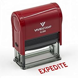 - The Vivid Stamp EXPEDITE Self Inking Rubber Stamp is a practical tool for clearly marking documents, orders, and paperwork that require urgent handling. Designed with a durable plastic body and a precision cut rubber text plate, this stamp produces clean, easy to read impressions that stand out in busy office, warehouse, and administrative environments. Its self inking design features a re inkable stamp pad, allowing for quick and simple ink refresh without replacing the entire unit. Available in three practical sizes, it works well across a range of document types, from small forms to full size paperwork. Ink color options include red, blue, and black, giving you flexibility to match your workflow or internal system, while the stamp body comes in a variety of colors for easy identification in shared workspaces. With an ergonomic shape and smooth press action, this stamp ensures consistent, reliable impressions with minimal effort and helps keep time sensitive tasks clearly identified and organized.