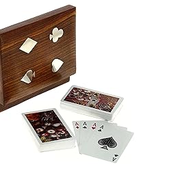 - The clue to the contents of this lovely box is the brass playing card motif inlaid on the lid. The box contains Two decks of cards, each one a high-quality pack. The hinged lid fits securely to hold the decks in place. Hand produced from sheesham wood, beautifully finished by master craftsmen, and enhanced by brass inlays, this is a piece that will no doubt become a family treasure to be kept for many years. This is a perfect gift for anyone in your life who loves a game of cards - and that's just about anyone