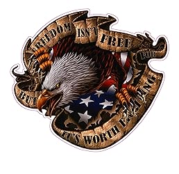 - Freedom Isn't Free Decal is 10" x 10" in size and is a Die Cut Decal which has a 3 year outdoor warranty. All of our decals are made from High Quality Material which is designed to take a beating outdoors for years. Our decals are designed and produced in the U.S.A. Complementary 2.5 x 3 inch flag decal with every order.