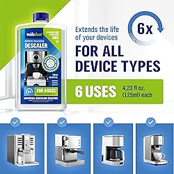 - WoldoClean Universal Descaler offers a professional, odorless cleaning solution for all types of coffee and espresso machines. This powerful liquid effectively removes limescale, calcium, and mineral deposits that build up through regular use, helping your machine perform like new again. The formula is gentle yet highly effective, protecting internal parts such as heating elements, seals, and metal surfaces. Compatible with Keurig, Nespresso, Breville, DeLonghi, Cuisinart, Ninja, Bunn, and similar coffee makers, as well as drip machines, capsule systems, kettles, and steamers. Regular descaling with WoldoClean helps prevent costly repairs and ensures consistent water flow, optimal brewing temperature, and improved coffee flavor. Users notice a smoother crema, richer aroma, and cleaner taste after each cycle. The liquid formula is fast-acting, residue-free, and safer than vinegar—no chemical smell or aftertaste. One 25.4 fl oz bottle provides up to six full descaling treatments, making it ideal for both home and professional use. Easy to use: simply mix one part descaler with four parts water, run the descaling cycle, and rinse twice with clean water. Maintain your coffee equipment effortlessly and enjoy fresh-tasting coffee every day.