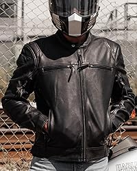 - First MFG Men's Motorcycle Leather JacketFeatures:100% Genuine Cowhide LeatherDiamond Naked Cowhide Scooter style with single snap banded collar and center zipper closure Two vented chest pocketsTwo zippered slash pocketsInner concealed weapon carry pockets with bullet snaps & tapered holsters Padded elbow detail as per pictureZippered underarm ventsZippered sleeves with gussets and Snap side tabsUnderarm gussets and grommets for ventilationPerforated Action back for best riding positions Insulated zip-out thermal liner Original YKK zippers Armor pockets for CE rated armorDescriptions:First Manufacturing makes hundreds of premium leather products, so quality, durability and comfort are assured. The Top Performer is one of these premium leather motorcycle jackets. A motorbike leather jacket that will have you feeling and looking good while you ride. It is in our premium category with center zipper closure. It has armored pockets available for Armor inserts protection if need be. Underarm grommets for ventilation purpose.The Top Performer Motorcycle Jacket was designed to give you the ultimate riding experience while being built to last. It will deliver everything you’ve come to expect from a leather motorcycle jacket.You will never regret buying a product from us! We have all the sizes available in Classic Black.Durability:Our quality assembling of leather jacket is reliable and great durability of stitching, hardware, zippers and design makes our product superior.