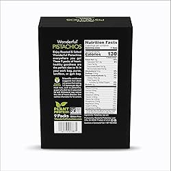 SIZE: Pack of 9 (1.5 Ounce) In-Shell – Don’t hold back on Wonderful Pistachios; Our Wonderful Pistachios are the perfect snack to have around the house and for on-the-go; These healthy snacks are the perfect, convenient pantry staple; See nutrition information for fat content FLAVOR: Roasted & Salted In-Shell Wonderful Pistachios - Our best-selling flavor for a reason; A combination of fiber, protein and fat may help to curb hunger between meals in a healthy way CALIFORNIA GROWN: Wonderful Pistachios grows all of its pistachios in California orchards, where we carefully tend and harvest them using the latest in sustainable practices. HEALTHY SNACKING: Pistachios are a healthy, protein-powered addition to any gathering - from party to picnic. Pistachios are a healthy choice for snacking on-the-go and around the house. They make for a wonderful travel snack or office snack. SIMPLY WONDERFUL PISTACHIOS: Gluten Free, Plant Based Protein, Kosher Certified, Halal Certified, and Non-GMO Project Verified. Contains tree nuts (pistachios), a good source of copper and vitamin B6.