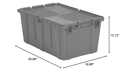 - ' Attached Lid Container, Outside Length 26-7/8 In., Outside Width 16-7/8 In., Outside Height 12-1/8 In., Inside Length 23-1/2 In., Inside Width 13-7/8 In., Inside Height 115 In., Volume Capacity 2.3 cu. ft., Load Capacity 70 lb., Material High Density Polyethylene, Color Gray, No. of Divider Slots Long 0, No. of Divider Slots Short 0 '