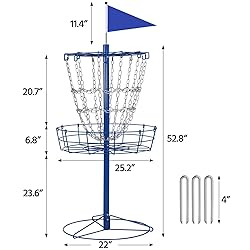 Stable & Robust: This solid disc golf target is made for the ultimate catching experience, with 12 durable galvanized chains that won't disappoint you. The welded joints and reinforced base make sure you won't have any wobbling. We even threw in 3 ground stakes to ensure double the stability! Portable & Easy-to-store: Built in a lightweight and collapsible structure, this disc golf basket is super convenient to transport wherever you go. Plus, when you're done using it for the day, it easily disassembles into a flat and compact size for easy storage. Thoughtful Details: This disc golf basket features a sizable 64 cm / 25.2″ basket designed to catch and store discs with ease. Besides, the colorful flag on top is sure to help boost your accuracy. Three ground anchors are included for improved stability. Practical & Fun: With this portable disc golf basket, you can practice and sharpen your skills at the park, backyard, or schoolyard. You can also bring it to a basketball gym or take it on your family camping or tailgate trip to add loads of fun. Simple Assembly: To ensure quick setup and disassembly, this flying disc basket only contains 6 pieces (base, base rod, basket, top rod, chain belt, and top ring), which only takes a few minutes to set up under the detailed instructions.