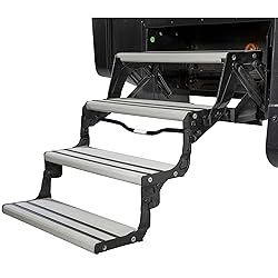 ADDED STABILITY — Anti-slip grips and a texturized surface allow campers to enter and exit their RV with more stability and traction, even in wet or muddy camping conditions EASY OPERATION — Crafted from lightweight aluminum and equipped with a built-in grab handle, campers can easily extend and store their steps whenever and wherever they need DURABILITY — Built to handle the toughest elements, the aluminum step platforms are rustproof, and the steel frame and linkages have been powder-coated for added strength STYLISH DESIGN — Alumi-Tread manual steps for campers feature a sleek Euro-style design, elevating the RV's exterior aesthetics for a sophisticated and modern appearance MULTIPLE SIZES — Available in triple and quad assemblies, each size is meticulously crafted to fit various RV entryways. It's essential to refer to the measurement guide before purchasing to ensure the perfect fit