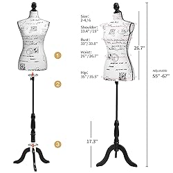 DURABLE & SOLID CORE STRONG: Solid mannequin body, quality tested wooden stand and stainless steel tube combination, making the mannequin form steady and durable enough to support heavy weight clothes, garment, wedding gown, furnishing and decorative material. The mannequin torso with stand is made of strong foam to allow direct pinning anywhere. HEIGHT ADJUSTABLE: The height of dress mannequin can be adjusted from approx 55 inch to 67 inch.The torso is approximately a US women's size 6. Shoulders: 15 inch, Chest: 33 6/7 inch, Waist: 26 7/9 inch, Hip: 35 3/7 inch. BEST CHOICE FOR DISPLAY: Beautiful adjustable dress form is perfect for displaying dresses, suits, and pretty much all clothing. EASY TO ASSEMBLE & DISASSEMBLE: With the installation instruction enclosed in the product package, this pinnable mannequin can be completed the assemble or disassemble in minutes without any tools. LIGHTWEIGHT YET ENVIRONMENTAL: The female mannequin is light weight and easy to move around. Made from strong styrofoam, user-friendly and eco-friendly.