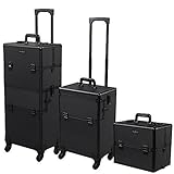 mefeir 2 in 1 Rolling Makeup Train Case Professional Cosmetic trolley on Wheels Aluminum Nail Cart Cosmetic Suitcase for professional makeup artist, Luggage Lockable w/4 Removable Wheels (Black)