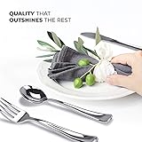 PERFECT FOR ANY OCCASION: Taste is evident in the sleek, modern, and stylish design of this silverware set. The sleek silver sheen gives the cutlery an elegant look that is perfect for weddings, receptions, formal dinners, banquets, and dinner parties as well as everyday mealtime, picnics, and informal events. PERFECT FOR ANY OCCASION: Taste is evident in the sleek, modern, and stylish design of this silverware set. The sleek silver sheen gives the cutlery an elegant look that is perfect for weddings, receptions, formal dinners, banquets, and dinner parties as well as everyday mealtime, picnics, and informal events. PREMIUM QUALITY: See the close resemblance to real silverware in its size, proportions and finish. This cutlery set is very sturdy and recyclable. BPA FREE DISPOSABLE CUTLERY: Feel the quality by the weight of it in your hand. The sleek silver finish will outshine any white or clear plastic flatware set elevating your table setting with stunning silver flatware that will complement any party theme. Same as real silverware, these plastic eating utensils are not microwaveable. However, they are disposable making the cleaning process less of a hassle. GREAT VALUE PACK: With 80 forks, 40 knives and 40 spoons, you’ll have more than enough to supply for a large gathering and to save up for your next big event. Great value for the price in addition with its heavy weight and durability. Measurements: Fork: 7.35"L, Knife: 7.9"L, Spoon: 7.0"L. ORDER YOURS TODAY!