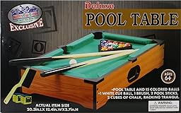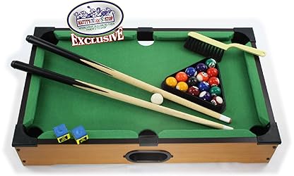 - Matty's Toy Stop Deluxe 20" Wooden Table Top Pool (Billiards) Table with 15 Colored Balls, 1 Cue Ball, 1 Brush, 2 Pool Sticks, 2 Cubes of Chalk & Racking Triangle....is AWESOME! You don't have to have a game room or basement to own this cool, table-top version of the game we all love. At 20" long, it will make a great addition to almost any room in the house. Lightweight and easy to move, it's big enough for heated action, but small enough to stow away when not in use. It also comes with two pool cues, 16 balls, triangle, brush and 2 chalk cubes. No assembly required, pull it out of the box and start having fun. For Ages 6 and up - 2 Players - Fun For The Whole Family!