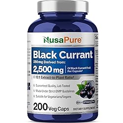 - NusaPure Black Currant 10:1 Extract provides 200 servings per container with a suggested intake of 1 vegetarian capsule per day, preferably taken after a meal. Each capsule delivers 250 mg of concentrated Black Currant extract, equivalent to 2,500 mg of Black Currant. With 200 veggie capsules per bottle, it offers a full 200-day supply designed for adults who value simplicity, consistency, and ease in their daily supplement routine. This formulation contains Black Currant extract prepared using a 10:1 extraction ratio and developed through quality sourcing and careful processing methods. Black Currant is commonly included in wellness-focused lifestyles and is provided here in capsule form for straightforward daily use. The capsule format removes the need for powders, juices, or preparation, making it easy to include in a morning or evening routine. Formulated to align with vegan and vegetarian preferences, this supplement is made with non-GMO ingredients and contains no unnecessary fillers. Each capsule uses a plant-based vegetable cellulose shell designed for easy swallowing and consistent daily use, offering a clean and transparent option for individuals who prioritize plant-based formulations and ingredient integrity. Manufactured in a cGMP registered facility, NusaPure Black Currant Extract is produced following high manufacturing and sourcing standards to ensure quality and consistency. The bottle format allows for convenient storage and portability, making it suitable for home or travel use. NusaPure delivers a dependable supplement option crafted with care, quality ingredients, and everyday usability in mind. Consult a physician if pregnant, nursing, taking medication, or having a medical condition. Keep out of reach of children.