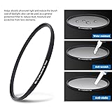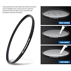 Helps absorb ultraviolet light and reduce the bluish cast of daylight Helps reduce dust, moisture, and scratches from reaching lens elements Crafted from 0.03" Japanese famous optical glass, double sides 12-layers of multi-resistant coating prevents internal ghosting and reflections while providing over 99.5% light transmission 12-layers of multi-resistant coating also offers greater protection to the filter substrate and helps it to stay clean for longer than with uncoated UV filters Ultra slim design (only 0.12" thick) to avoid vignetting on wide angle lenses