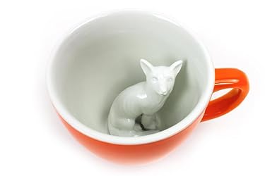 These cups have humorous, fun creatures in the bottom that are slowly revealed as you drink. 11 fluid ounce (325 ml) Made of high-fire ceramics Exterior color is Red Orange; interior color is White Diameter: 4.0 inches (10 cm) / Height: 3.2 inches (8 cm) Dishwasher safe and microwavable Perfect gift for coffee and tea lovers, animal lovers, and holiday/office presents. Boxed in premium packaging.