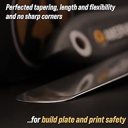 Durable, rigid construction; Solid rivets keep the blades in place, no more repurposed artist palette spatulas with spinning, twisting and turning cramp rings! Long knife with a beveled front edge; Slides very gently underneath prints with ease to protect the build bed surface yet provides good reach and allows prying Stiff, hardened stainless steel blades; Flexible but not too thin or flimsy, safer rounded edges, work well with different size objects without damaging them Stylish and useful; The smaller offset spatula has a black ergonomic rubber comfort grip, the knife has a big thick wood handle suitable for larger parts Essential addition to your 3D Printer accessories; No more putty knives to remove prints. Doubles as a leveling tool to scrape off stuck-on plastic from the print bed