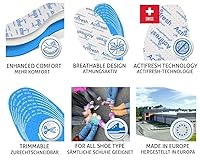LATEX FOAM CUSHIONS – kids insoles by Kaps have two layers of latex foam cushions – white and blue providing excellent walking comfort for your kids. CONTENT OF SUBSTANCE ACTIFRESH – Kaps insoles for kids have dirt prevent content of substance Actifresh by Sanitized protecting your child feet from molds. EXCELENT AIR CIRCULATION – delicate fabric and perforation of the boot insoles provides excellent air circulation increasing feeling of freshness for the feet. CUT TO FIT ADJUSTABLE SIZE – shoe pads for kids have size marking on the bottom ensuring that you will definitely get the right size – all you need to do is cut out required size pad accoriding marked lines. The insoles are cut-to-fit. Use guides to cut out the right size for your feet. The length of the insoles is 23 cm (9 inch) SHOCK ABSORBING – shock absorbing foam insoles provide excellent comfort for kids feet whilst Actifresh top cloth works as prevention from odor.
